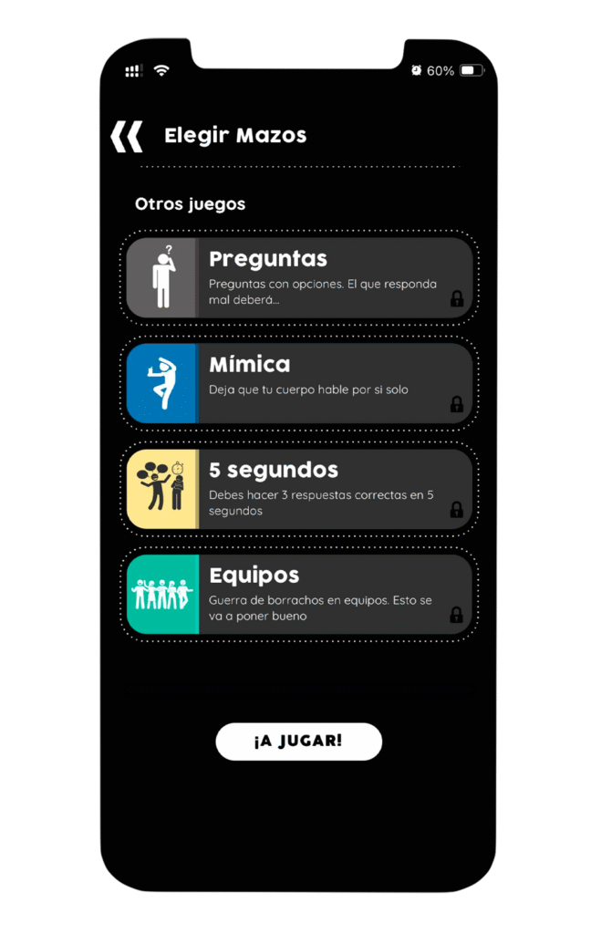 Categorías variadas como Clásico, Yo nunca, Verdades, Mímica, Previa, Zarpado y muchas más.