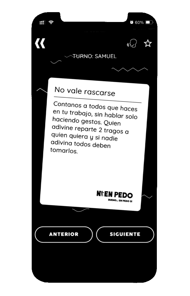 Ni en pedo es una app desarrollada con el objetivo de ofrecer una plataforma divertida y dinámica para reuniones sociales. A través de un sistema de cartas digitales con más de 3.000 retos, preguntas y pruebas, la app anima cualquier encuentro, ya sea entre amigos, familia o compañeros.